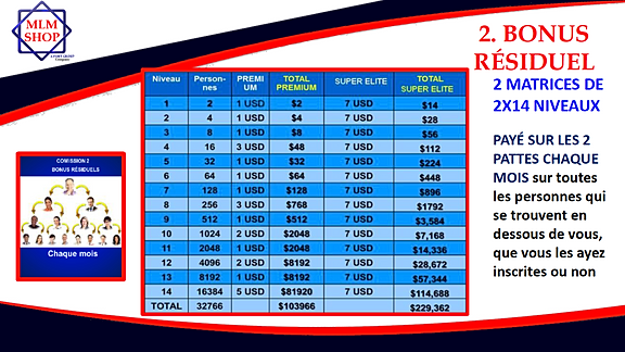 Comme vous pouvez le voir dans le tableau ci-dessous il y a 14 niveaux dans la matrice. En Prémium ou Super Elite, pour chaque niveau vous touchez une certaine somme sur l’inscription de nouveaux membres. Que vous les ayez parrainés ou pas (matrice forcée) !