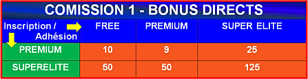 A chaque fois que vous parrainez directement un affilié, vous recevez un bonus une seule fois.Si vous êtes un membre GRATUIT, et que vous parrainez une personne qui achète une boutique Premium vous gagnerez 10$, et si vous parrainez une personne qui achète une boutique Super élite, vous gagnerez 50$.
