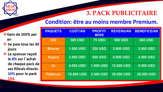 - Premium : Cette adhésion coûte 49$ par mois. Lorsque vous adhérez en Premium, vous obtenez une boutique en ligne professionnelle et vous avez la possibilité de commencer à gagner de l’argent en investissant dans des packs publicitaires (ceux-ci sont limités à 4 000 $). L’utilisation de la boutique est facultative, cependant si vous n’avez pas de produits à vendre vous pouvez l’utiliser pour faire de la publicité pour vos autres business, marketing de réseau, entreprises… Et si vraiment vous n’êtes pas intéressé, vous pouvez demander à la compagnie une boutique de marketing viral. Ce sont des logiciels mis en vente par la compagnie, et vous gagnerez 50% de ce qui est vendu ! Et là encore une fois, c’est facultatif !